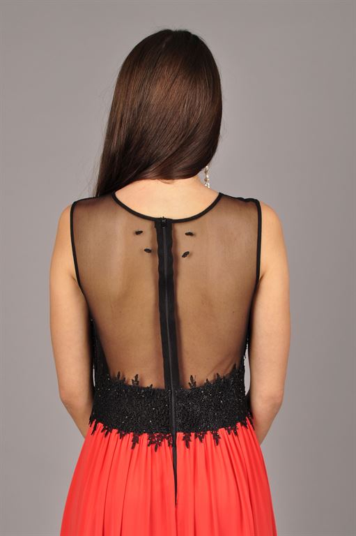 Červenočerné šifonové šaty, sukně v pase jemně řasená. Živůtek z černého tylu zdobený černou krajkou. Šaty mají nádherná tylová záda. Velikost 36, lze upravit až na vel.34.