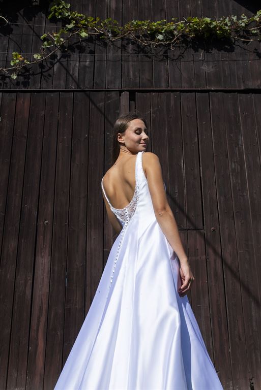 Luusní saténové šaty jednoduchého střihu .Na šatech jsou zajímavě řešená záda.