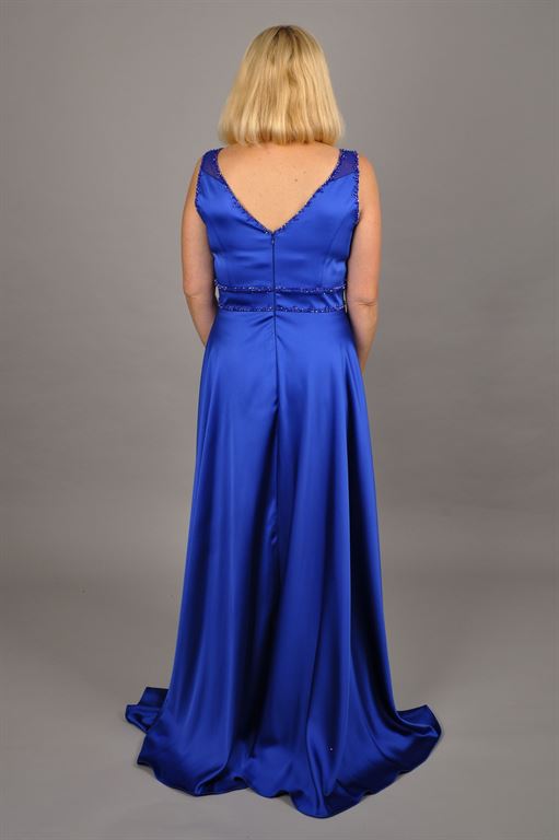 Nádherné saténové šaty jednoduchého střihu, které zdobí široký pásek a korálky v oblasti ,, V " a paží. Velikost 44.