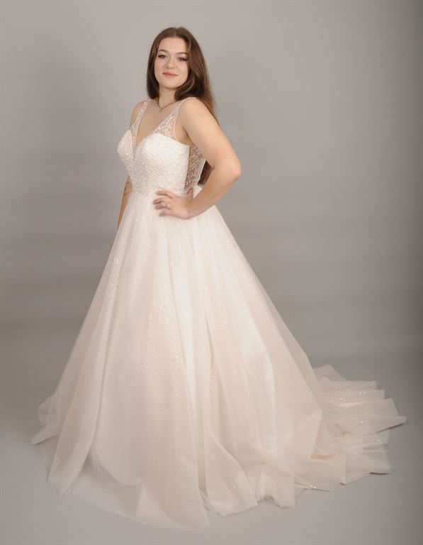 Luxusní svatební šaty zn.JARICE. Šaty mají jemně růžovou barvu.Korálkový živůtek zdobí krásně řešená ramínka ,která otevírají na zádech hludokém U.Sukni dozdobuje třpitkatý tyl který dodává šatům jedinečné kouzlo. Šaty mají vel.44 lze upravit na vel.40.