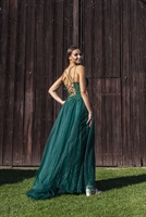 Krásné tmavozelené šaty s tylovou sukní a nádherně řešenými zády.