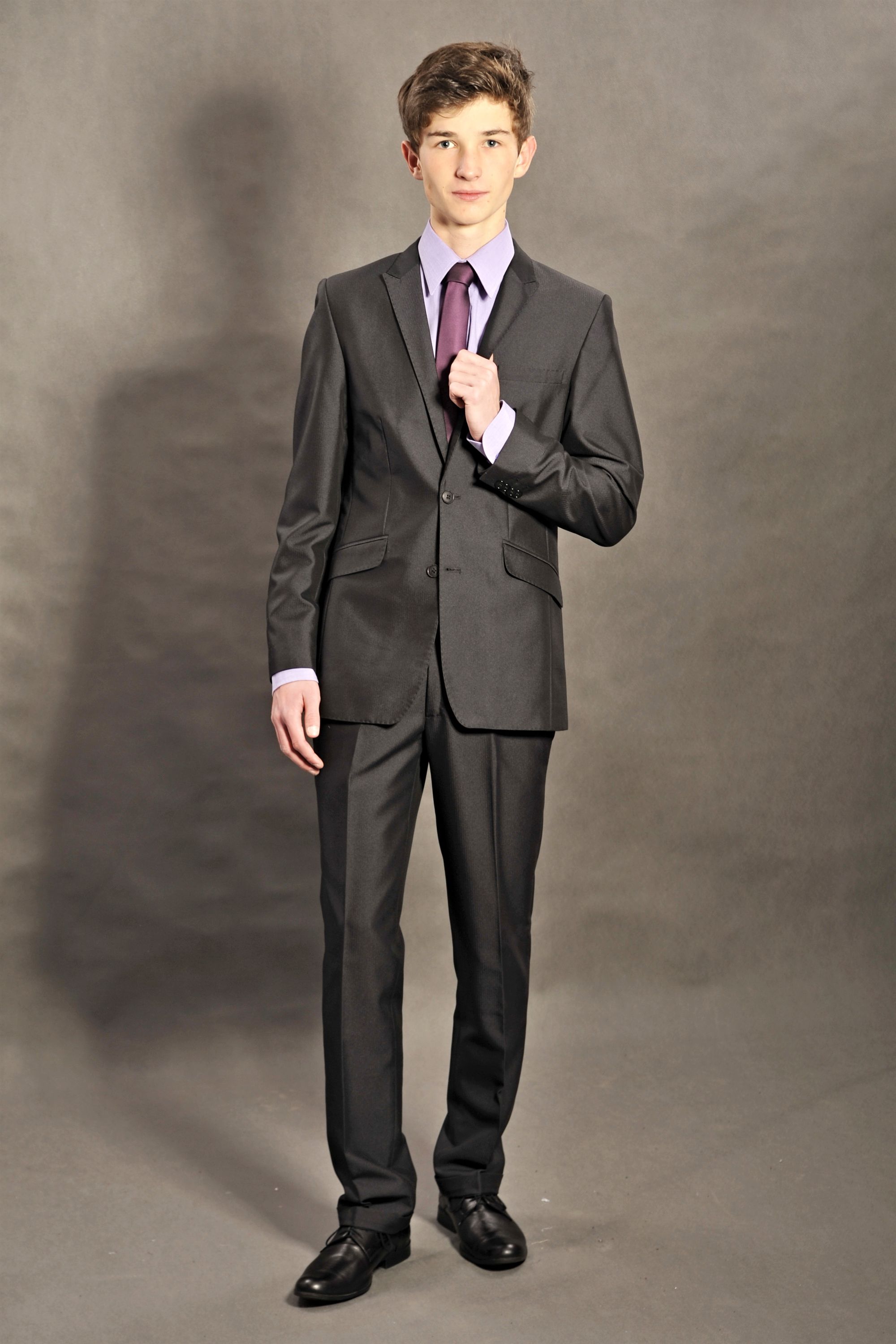 Tmavošedý chlapecký oblek slušivého střihu.Vhodný do tanečních.Velikost 44.na výšku 176cm. Obvod v pase 80cm délka 103. Kalhoty jdou upravit na dálku i v pase .